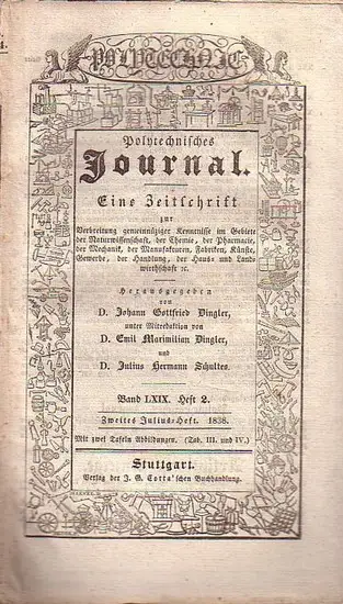 Polytechnisches Journal. Hrsg. v. Johann Gottfried Dingler, Emil Maximilian Dingler und Julius Hermann Schultes: Polytechnisches Journal. Band LXIX. Heft 2. Zweites Julius=Heft 1838. (=19. Jahrgang, 14. Heft). Eine Zeitschrift zur Verbreitung gemeinnü
