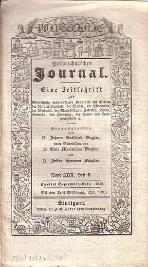 Polytechnisches Journal. Hrsg. v. Johann Gottfried Dingler, Emil Maximilian Dingler und Julius Hermann Schultes: Polytechnisches Journal. Band LXIX. Heft 6, Zweites September=Heft 1838. (= 19. Jahrgang, 18. Heft). Eine Zeitschrift zur Verbreitung geme