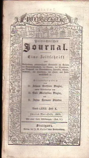 Polytechnisches Journal. Hrsg. v. Johann Gottfried Dingler, Emil Maximilian Dingler und Julius Hermann Schultes: Polytechnisches Journal. Band LXXII. Heft 4. Zweites Mai=Heft 1839. (= 20. Jahrgang, 10. Heft). Eine Zeitschrift zur Verbreitung gemeinnüz