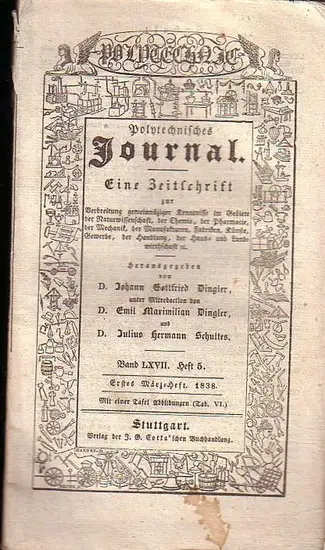 Polytechnisches Journal. Hrsg. v. Johann Gottfried Dingler, Emil Maximilian Dingler und Julius Hermann Schultes: Polytechnisches Journal. Band LXVII. Heft 5. Erstes März=Heft 1838. (= 19. Jahrgang, 5. Heft). Eine Zeitschrift zur Verbreitung gemeinnüzi