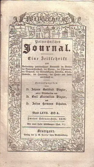 Polytechnisches Journal. Hrsg. v. Johann Gottfried Dingler, Emil Maximilian Dingler und Julius Hermann Schultes: Polytechnisches Journal. Band LXVII. Heft 4. Zweites Februar=Heft 1838. (= 19. Jahrgang, 4. Heft). Eine Zeitschrift zur Verbreitung gemein