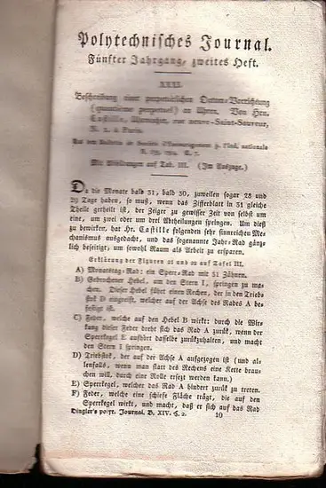 Freie Beschreibung: Gr.-8°. Etwas angestaubte Interimsbroschur mit handschriftl. Bandbez. Die seitl. Ränder nicht beschnitten. Mit einigen Knickstellen. Komplett mit Seiten 145-272 (unaufgeschn.) Ohne Kupfertafel. Gutes Exemplar. -- Siehe Kirchner 3940. - Das umfangreichste deutschsprachige polytechnische Journal des beginnenden Industriezeitalters ist ein unschätzbares Archiv des technischen Fortschritts auf industriellen, wirtschaftlichen, arbeitstechnischen und hauswirthschaftlichen Gebieten