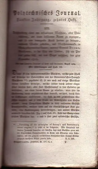 Freie Beschreibung: Gr.-8°. Etwas angestaubte Interimsbroschur mit handschriftl. Bandbez. Die seitl. Ränder nicht beschnitten. Mit einigen Knickstellen. Komplett mit Seiten 129-256. (unaufgeschn. ) Ohne Kupfertafel. Gutes Exemplar. -- Siehe Kirchner 3940. - Das umfangreichste deutschsprachige polytechnische Journal des beginnenden Industriezeitalters ist ein unschätzbares Archiv des technischen Fortschritts auf industriellen, wirtschaftlichen, arbeitstechnischen und hauswirthschaftlichen Gebieten