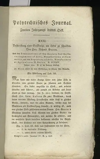 Freie Beschreibung: Gr.-8°. Interimsbroschur mit handschriftl. Bandbez. Die seitl. Ränder nicht beschnitten. Mit einigen Knickstellen. Komplett mit Seiten 257-384, ohne die Tafel. (unaufgeschn.). Innen gutes Exemplar. -- Siehe Kirchner 3940. - Das umfangreichste deutschsprachige polytechnische Journal des beginnenden Industriezeitalters ist ein unschätzbares Archiv des technischen Fortschritts auf industriellen, wirtschaftlichen, arbeitstechnischen und hauswirthschaftlichen Gebieten
