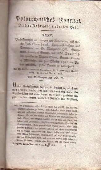 Gr.-8°. Interimsbroschur mit handschriftl. Bandbez. Die seitl. Ränder nicht beschnitten. Mit einigen Knickstellen. Komplett mit Seiten 263-390 (unaufgeschn.) und einer mehrfach gefalteten Kupfertafel und einer mehrf. gef. tabell. Übersicht. Gutes Exemplar. -- Siehe Kirchner 3940. - Das umfangreichste deutschsprachige polytechnische Journal des beginnenden Industriezeitalters ist ein unschätzbares Archiv des technischen Fortschritts auf industriellen, wirtschaftlichen, arbeitstechnischen und hauswirthschaftlichen Gebieten