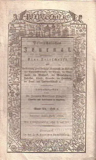 Gr.-8°. Originalbroschur mit Rücken- und Deckeltitel und Vorderdeckelillustration. Der Umschlag wenig angestaubt, die seitl. Ränder nicht beschnitten. Mit einigen Knickstellen. Komplett mit Seiten 513-592,XVI S. Reg. (nicht aufgeschn.) Mit zwei mehrfach gefalteten Kupfertafeln, gutes Exemplar. -- Siehe Kirchner 3940. - Das umfangreichste deutschsprachige polytechnische Journal des beginnenden Industriezeitalters ist ein unschätzbares Archiv des technischen Fortschritts auf industriellen, wirtschaftlichen, arbeitstechnischen und hauswirthschaftlichen Gebieten