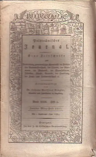 Freie Beschreibung: Gr.-8°. Originalbroschur mit Rücken- und Deckeltitel und Vorderdeckelillustration. Der Umschlag wenig angestaubt, die seitl. Ränder nicht beschnitten. Mit einigen Knickstellen. Komplett mit Seiten XVI,489-568. (unaufgesch.). Mit einer mehrfach gefalteten Kupfertafel, gutes Exemplar. -- Siehe Kirchner 3940. - Das umfangreichste deutschsprachige polytechnische Journal des beginnenden Industriezeitalters ist ein unschätzbares Archiv des technischen Fortschritts auf industriellen, wirtschaftlichen, arbeitstechnischen und hauswirthschaftlichen Gebieten