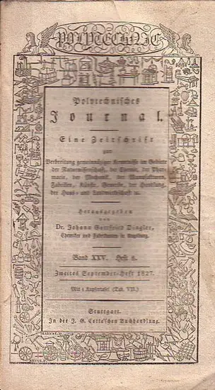 Polytechnisches Journal. Hrsg. v. Johann Gottfried Dingler: Polytechnisches Journal. Band XXV. Heft 6, Zweites September=Heft 1827. (= 8. Jahrgang, 18. Heft). Eine Zeitschrift zur Verbreitung gemeinnüziger Kenntnisse im Gebiete der Naturwissenschaft,