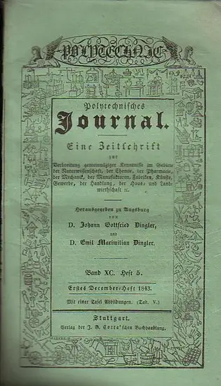 Polytechnisches Journal. Hrsg. v. Johann Gottfried Dingler und Emil Maximilian Dingler: Polytechnisches Journal. Band XC. Heft 5. Erstes December=Heft 1843. (= 24. Jahrgang, 23. Heft). Eine Zeitschrift zur Verbreitung gemeinnüziger Kenntnisse im Gebi