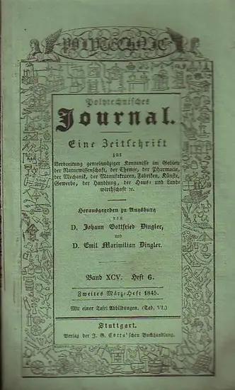 Polytechnisches Journal. Hrsg. v. Johann Gottfried Dingler und Emil Maximilian Dingler: Polytechnisches Journal. Band XCV. Heft 6. Zweites März=Heft 1845. (= 26. Jahrgang, 6. Heft). Eine Zeitschrift zur Verbreitung gemeinnüziger Kenntnisse im Gebiete