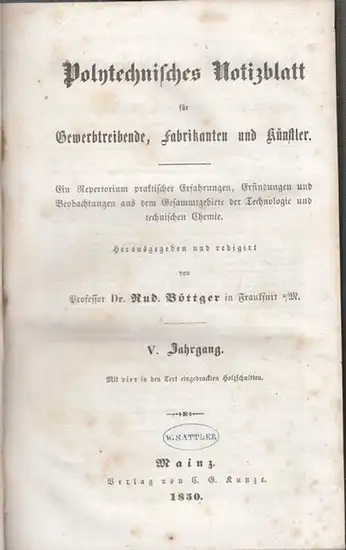 Polytechnisches Notizblatt. - Herausgegeben und redigirt von Rud. Böttger. - Beiträge von L. Elsner / Franz Varrentrapp / Urban Jürgensen / Richard Dugdale / A. Martin u. a: 1850 und 1851, V. und VI. Jahrgang in einem Band: Polytechnisches Notizblatt für