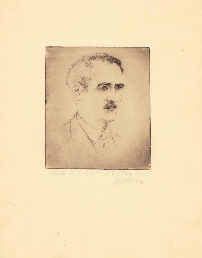 Porträt eines Mannes mit Schnurrbart. Schulterstück im Halbprofil. Kaltnadelradierung in Braun auf Kupferdruckpapier, u. re. mit Bleistift signiert, Héroux, Bruno