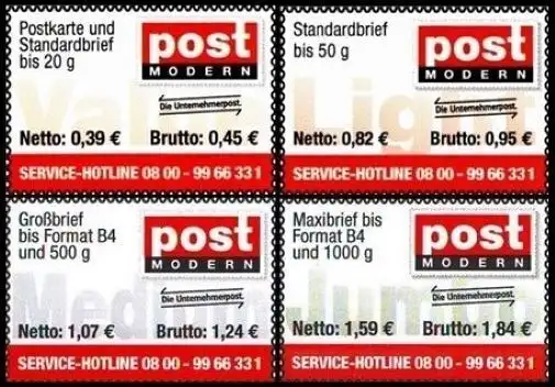 • MichSeite PostModern: MiNr. 10 - 13, 01.10.2003, "Dauerserie", Satz, postfrisch Beschreibung \nAusgabeland: Bundesrepublik Deutschland \nPostdienstleister: PostModern (Media Logistik), Dresden \nAusgabeanlass: Briefmarkenausgabe "Dauerserie" Katalognummer: MiNr. 10 - 13 Ausgabedatum: 01.10.2003 Nominale: Satz (4 Werte) zu 0,45 EUR, 0,95 EUR, 1,24 EUR, 1,84 EUR \nTyp: - \nErhaltung: selbstklebend, gerade gestanzt, postfrisch \nHinweis: -
