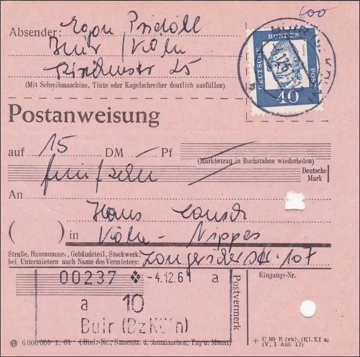 Instruction postale Cologne 1961. ..
