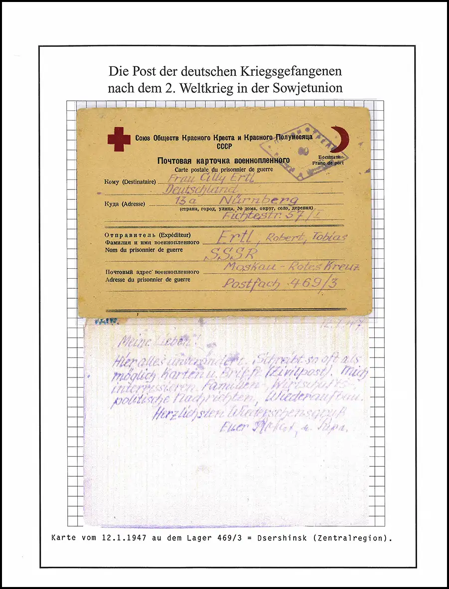 Poste de prisonniers de guerre Camp 469/ 3 Dzerjinsk URSS vers Nuremberg du 12.1.1947