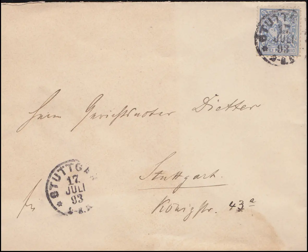 Poste privé Stuttgart 3 Cheval sautant 3 Pfennig EF Lettre STUTTGART 17.7.1893