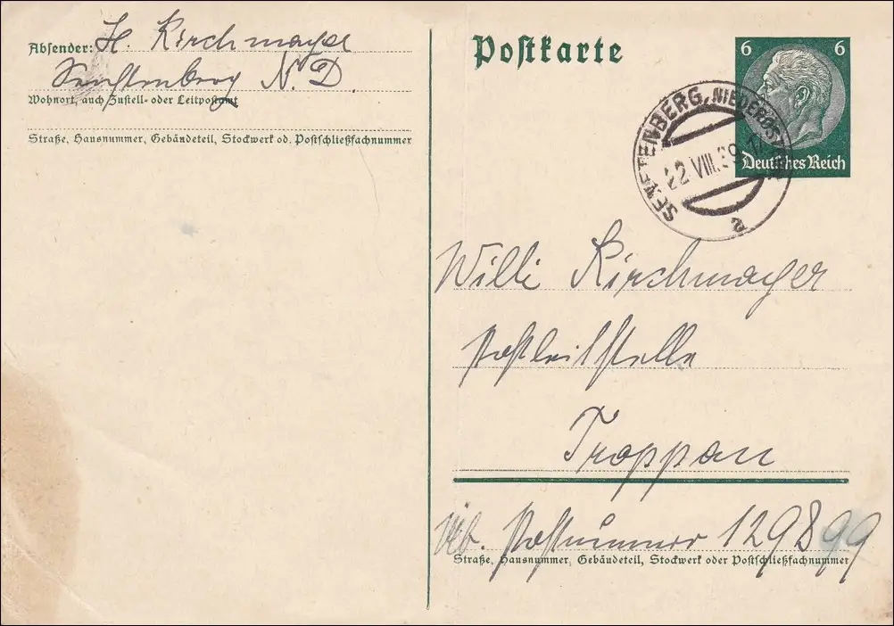 Carte postale: Exercise entier de Feldpost 22.VIII 1939, Sindeltenberg Niederöst