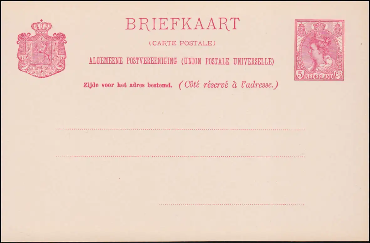 Carte postale P 24 Reine Wilhelmina 5 C. 1899, non utilisée ** / MNH