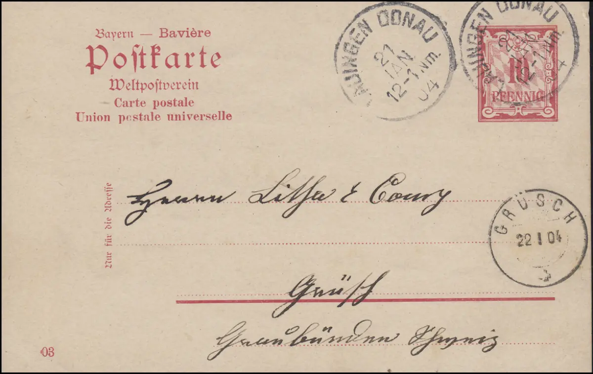 Postkarte P 67/01 Ziffer mit DV 03, LAUINGEN DONAU 21.1.1904 nach GRÜSCH 22.1.04