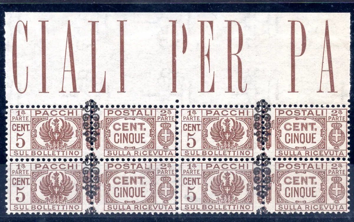 Postpakete Cent. 5 Friese mit stark nach oben verschobenem Aufdruck Vollgummi - Postpakete Cent. 5 Fries Nr. 48 Viertel mit stark nach oben verschobenem Aufdruck (zu Pferd) - Unveröffentlicht (ev. n. 48ba) Code 279/11