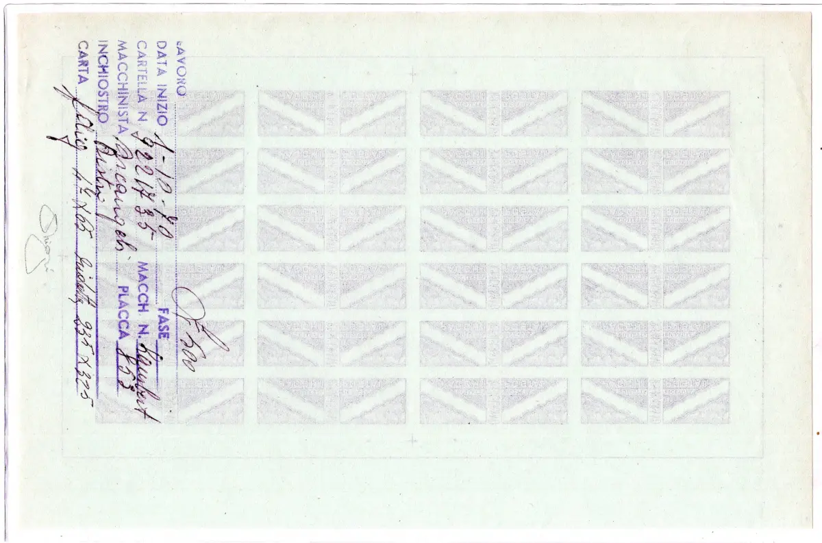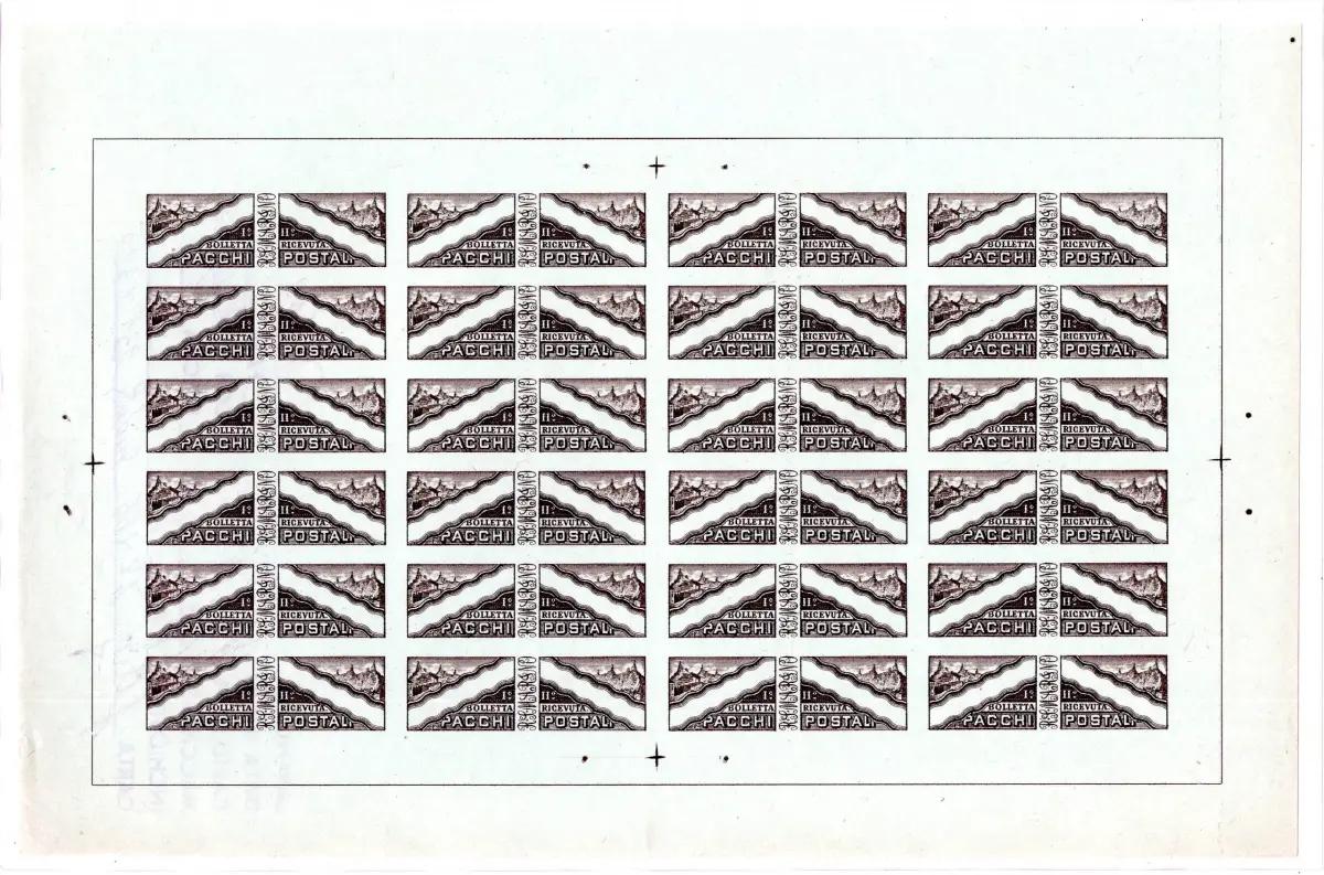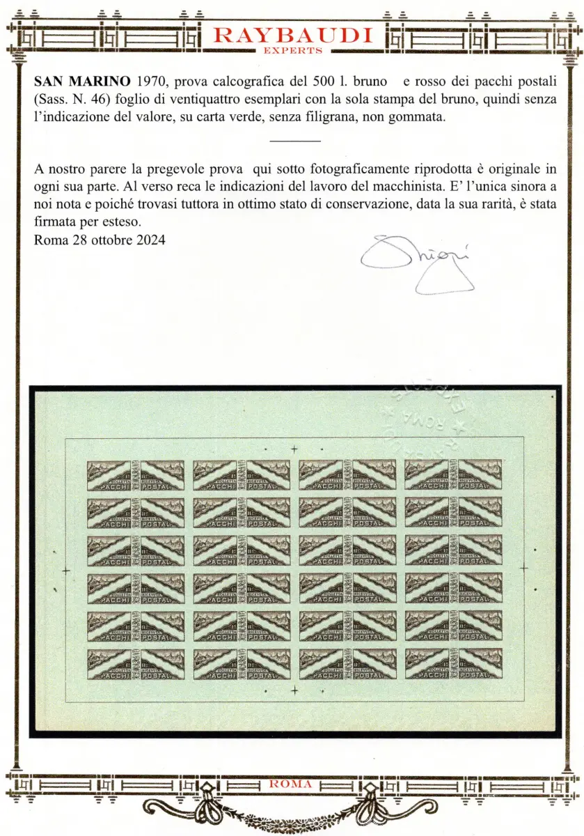 M - ohne Gummi - - Postpakete 500 Lire - Bogen mit 24 Exemplaren des verwendeten Drucktests für den braunen Rahmen im Wert von 500 Lire der Serie - Die Briefmarken sind daher ohne Wertangabe auf grünem Papier ohne Wasserzeichen und ohne Gummi - Extrem seltenes, einziges bekanntes Blatt Raybaudi Gold zertifiziert Cod. 2470/WEB
