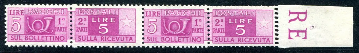 Postpakete Lire 5 Sorten Zahnung Vollgummi (MNH) - Postpakete Lire 5 Nr. 72aca waagerechtes Paar b. von f. mit dem rechten Exemplar Doppelverzahnung nur im rechten Abschnitt - Linguella Spur am Rand und auf der Normalmarke - Ungewöhnlicher Code Nr. 767/2