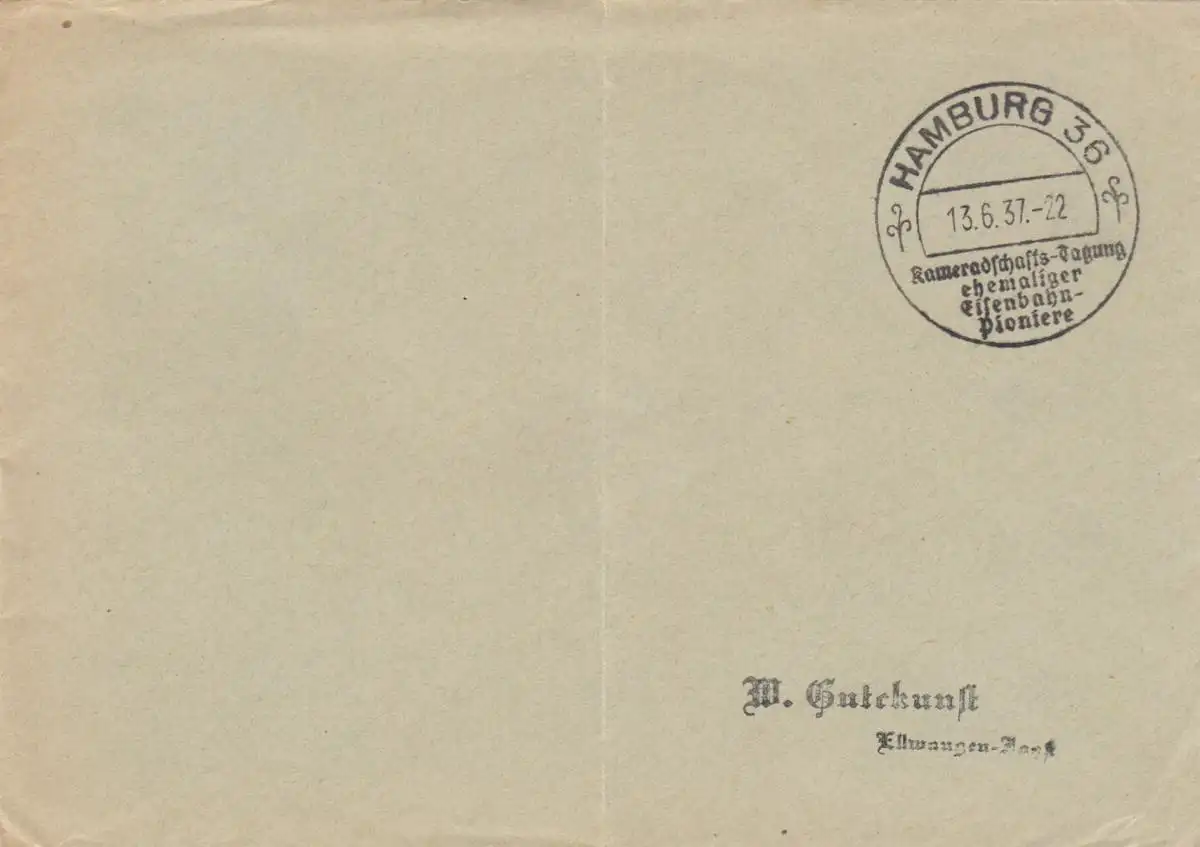 Affaire postale Kuvert 1938 Hambourg Réunion de camarade d'anciens pionniers ferroviaires