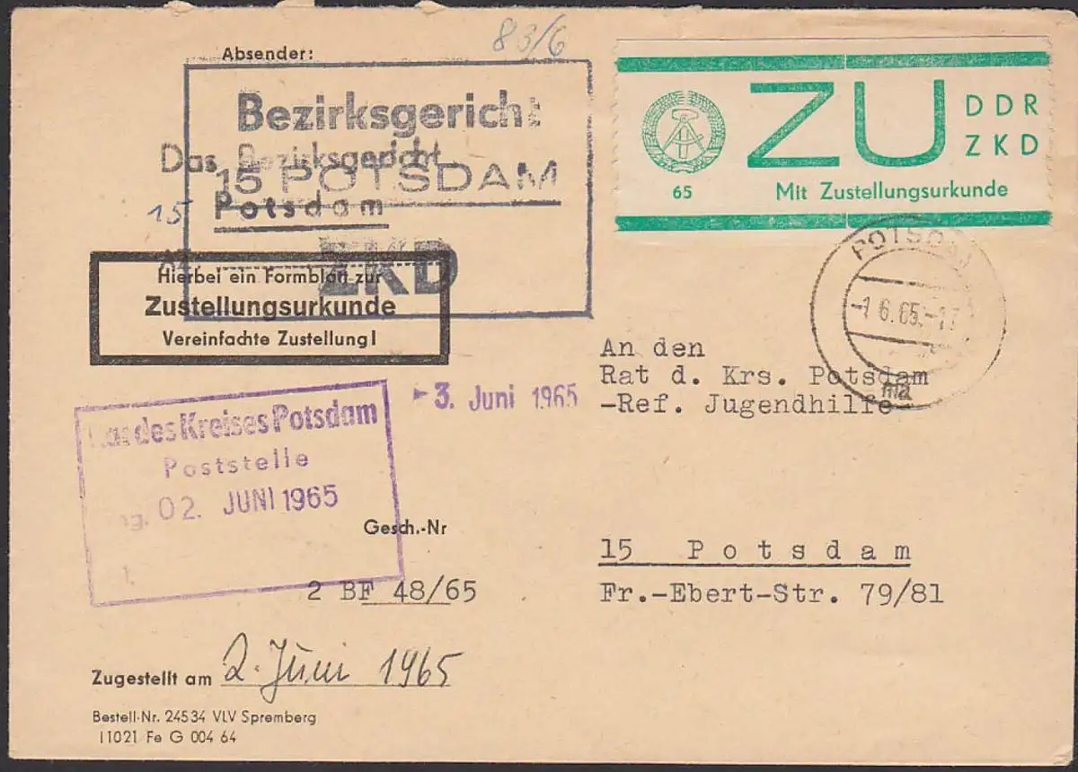 Potsdam R3 ZKD-Stempel Bezirksgericht E1 Zustellungsurkunde, 1.6.65, Ortsbrief