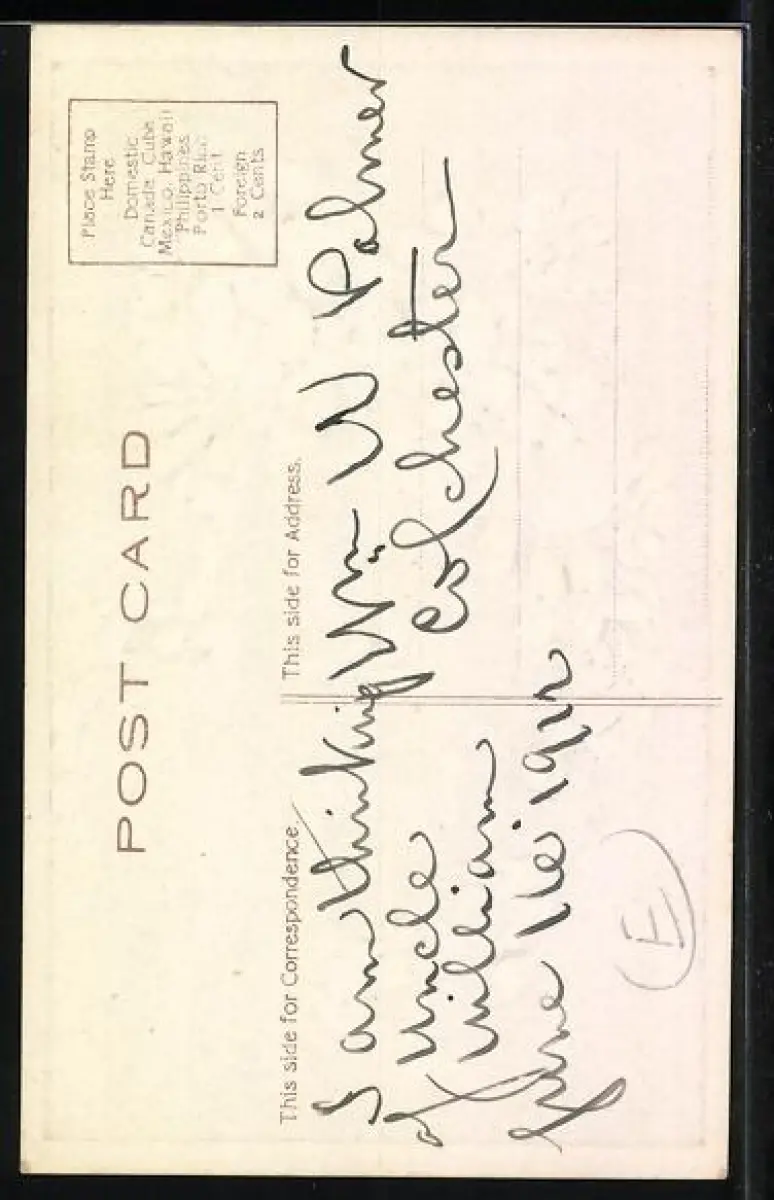 Personenbezogene Daten auf der Rückseite der Karte wurden durch blauen Textmarker unkenntlich gemacht. Die blauen Stellen sind auf die Vorderseite durchgeweicht und wirken sich negativ auf das Postkartenfoto aus