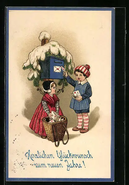 Präge-AK Herzlichen Glückwunsch zum neuen Jahre!, Kinder am Postkasten, Brief