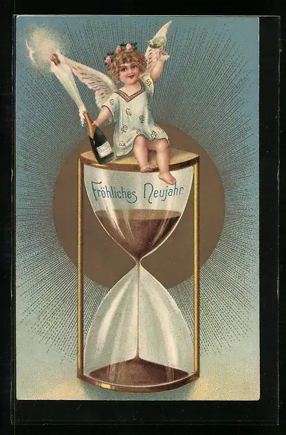 Präge-AK Neujahrsengel sitzt auf einer Sanduhr und öffnet einen Sekt