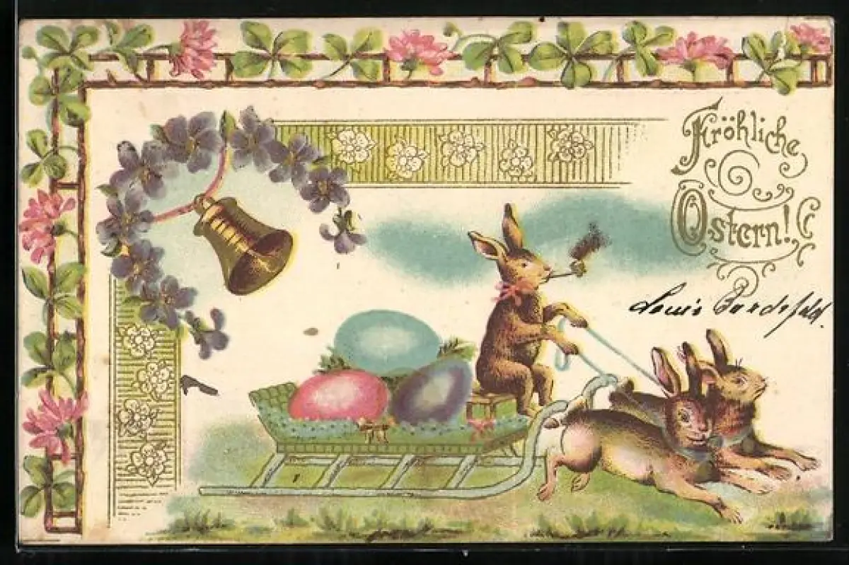 Präge-AK Osterhase im Schlitten mit Ostereiern, Veilchen und Kleeblätter
