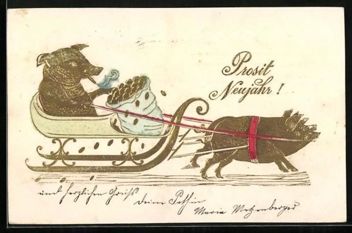 Präge-AK Schwein sitzt mit Goldmünzen in einem Schlitten, Prosit Neujahr! vermenschlichte Tiere