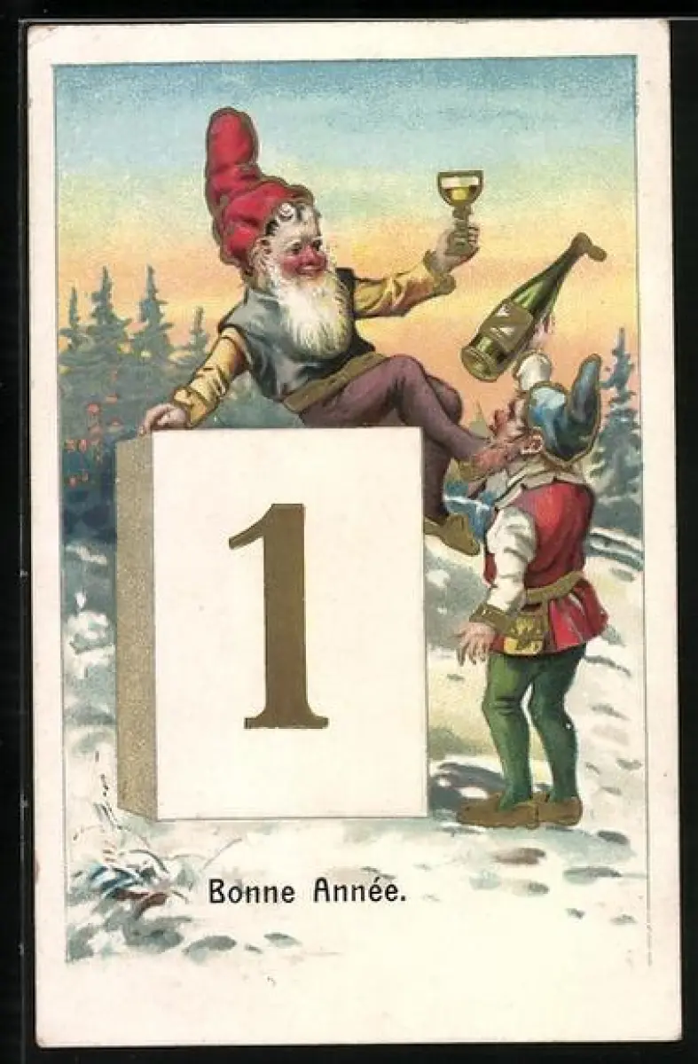 Präge-AK Zwerge feiern das Neue Jahr mit Sekt, Bonne Année