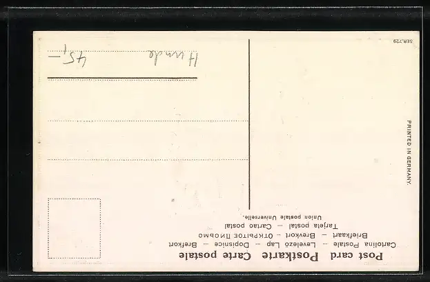 Personenbezogene Daten auf der Rückseite der Karte wurden durch blauen Textmarker unkenntlich gemacht. Die blauen Stellen sind auf die Vorderseite durchgeweicht und wirken sich negativ auf das Postkartenfoto aus