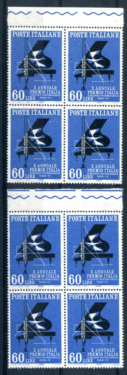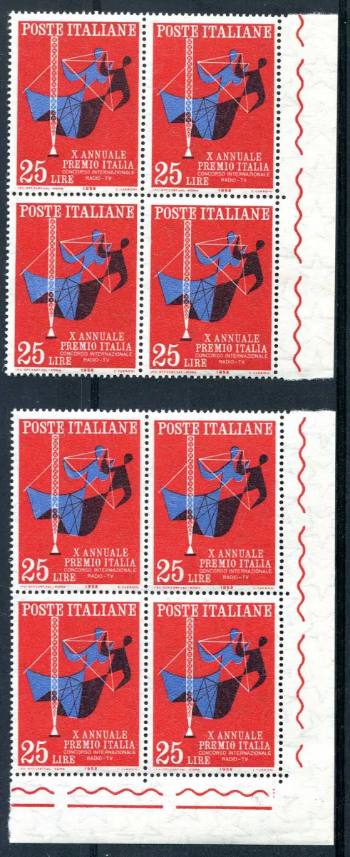 Premio Italia Radio TV Übertragungsvielfalt Vollgummi - Premio Italia Radio TV Nr. 849/850 - Lot von vier Vierteln (zwei von 25 Lire und zwei von 60 Lire) in jeweils zwei offensichtlichen Übertragungsvarianten (Retuschen) - Schönes Set Code 737/3