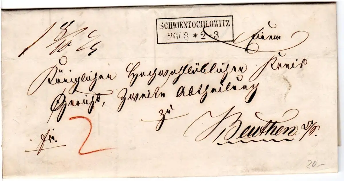 Preussen 1858, Schlesien-R2 Schwientochlowitz klar auf Franko Brief n. Beuthen