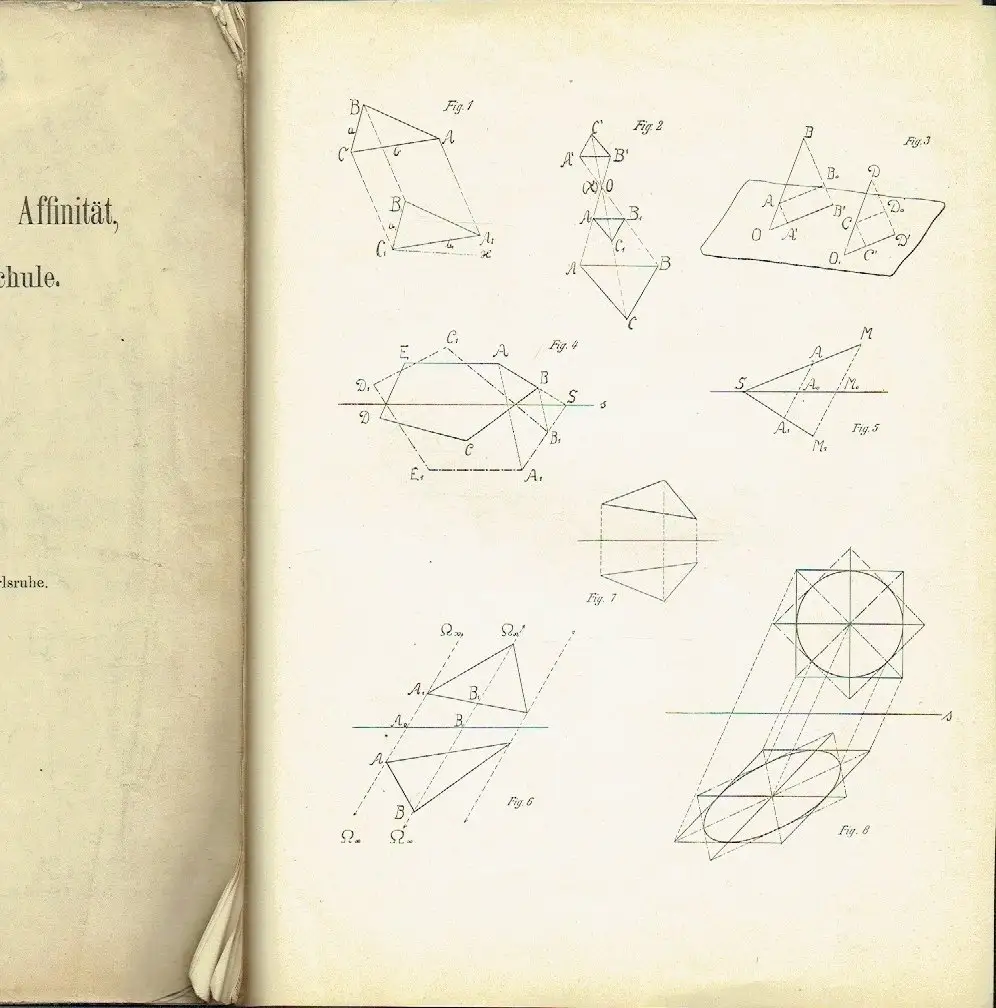 mittlerer Zustand, Gebrauchs- und Alterungsspuren: Vorder- und Rückseite verschmutzt - Seiten eselsohrig - Rücken teils aufgerissen - Falz der letzten Tafel teils durchgewetzt (da sie gleichzeitig den Falz der Rückseite darstellt), 58 Lehrsätze und Aufgaben - Perspektive Kongruenz - Perspektive Ähnlichkeit ebener Figuren - Affinität - Perspektive Kollineation, Softcover, ca. 20,5 x 25,5, 54 Seiten mit 62 Bildern auf 9 Ausschlagtafeln