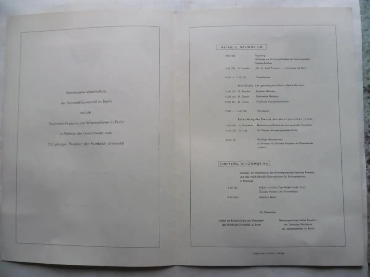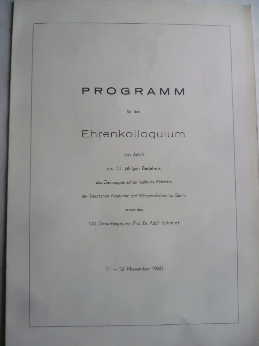 Programm für das Ehrenkolloquium aus Anlaß des 70-jährigen Bestehens des Geomagnetischen Institutes Potsdam sowie des 100. Geburtstages von Prof. Dr. Adolf Schmidt 11.-12. November 1960. A4, 3 Seiten, minimale Knitterspur am unteren Rand. Gut erhalten.