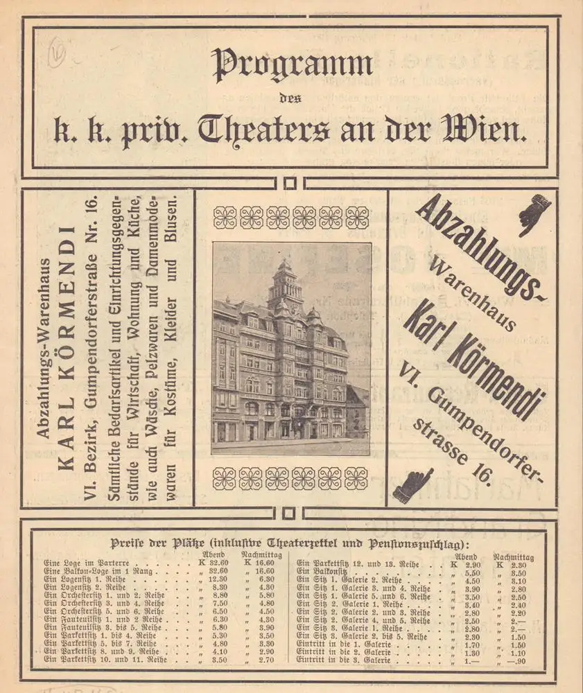 (Wien, k.k. Hoftheater-Druckerei, 1908), 8 S. Mit 1 Abb. u. zahlr. tls. illustr. Anzeigen. Geheftet.