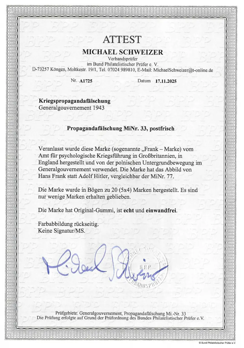 Propagandafälschung MiNr. 33, Generalgouvernement - Hans Frank Marke, BPP Attest