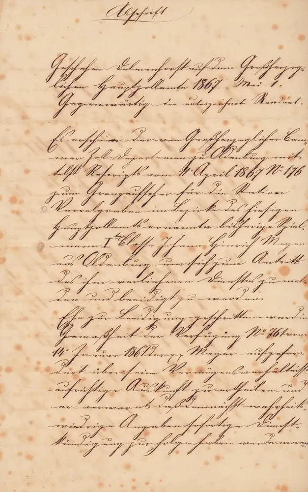 Titel: Protokoll der Vereidigung eines neuen Grenzaufsehers auf dem Großherzoglichen Hauptzollamt zu Delmenhorst. Abschrift in deutscher Kurrentschrift