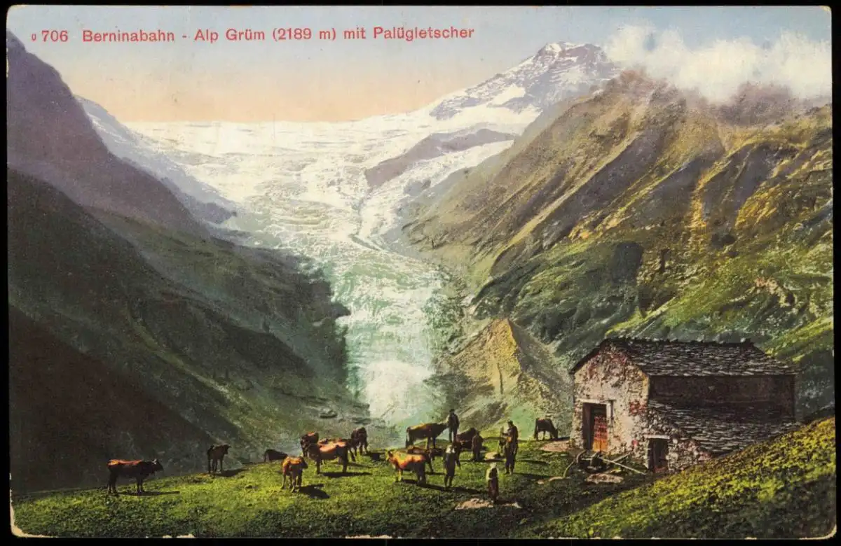 Puschlav Poschiavo Berninabahn Alp Grüm (2189 m) mit Palügletscher 1919