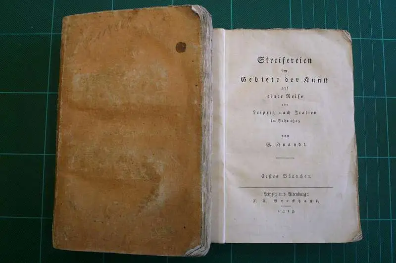 Johann Gottlob von Quandt betätigte sich als Kunsthistoriker und Kunstmäzen. - Die "Streiferen" berichten über die 1811 unternommene Studienreise Quandts nach Italien. Eine weiterer Aufenthalt in Rom 1818 brachte ihn mit zahlreichen damals dort vereinigten deutschen Künstlern in Kontakt. - Umschläge etwas berieben und fleckig, Schnitt etwas angestaubt, Seiten an den Ecken teilweise etwas gestauchtg, sonst innen gutes frisches Exemplar.