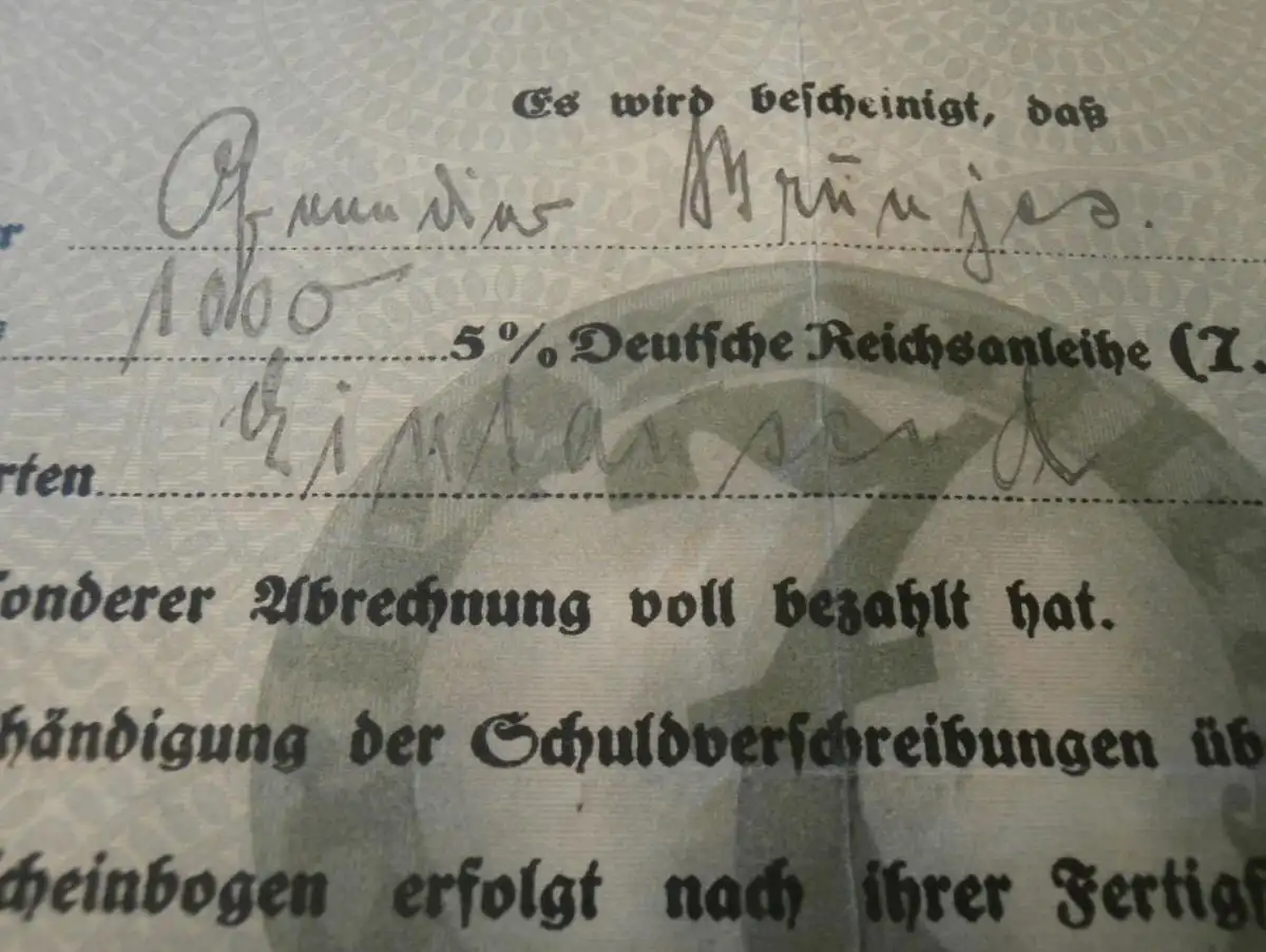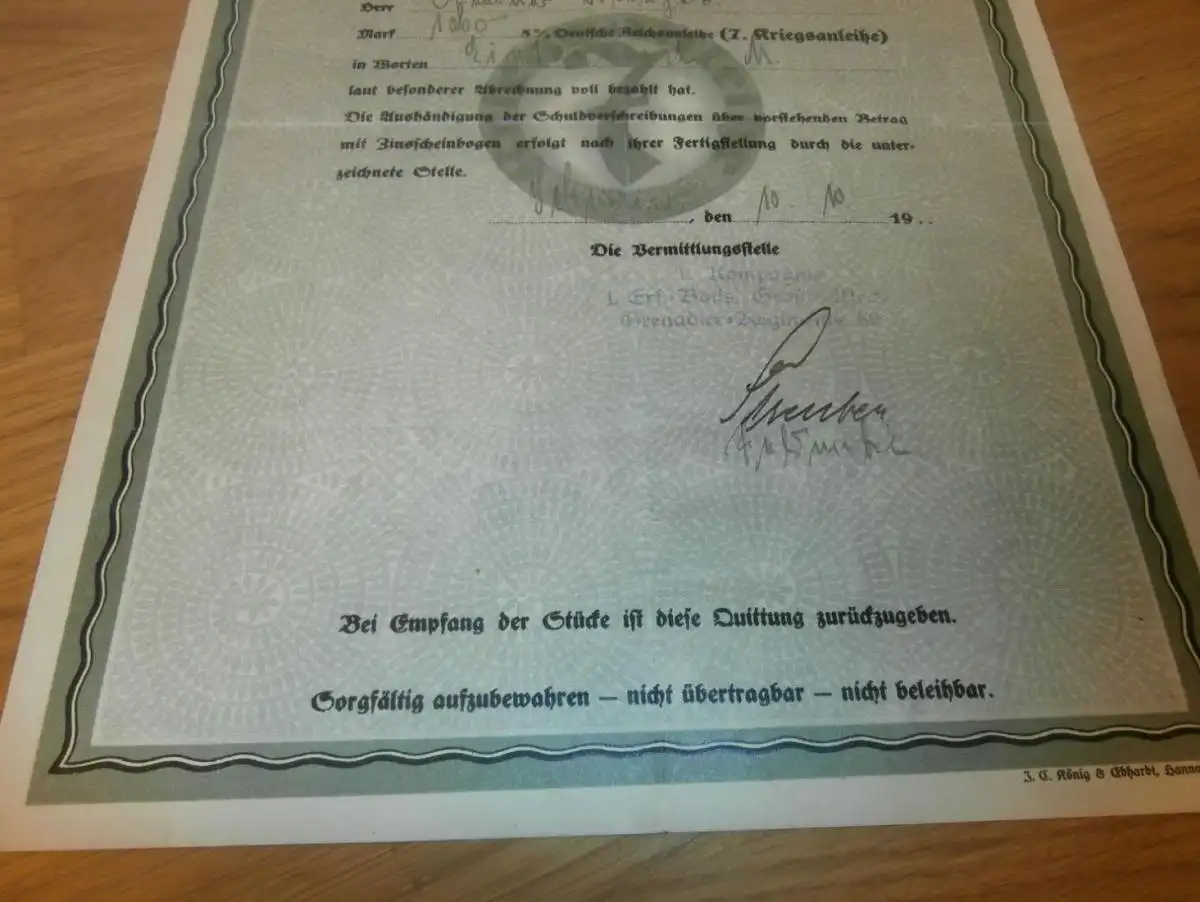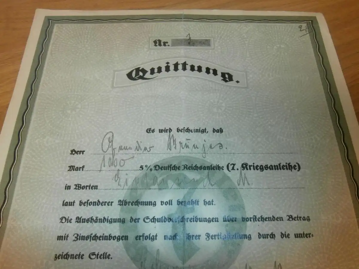 Quittung Nr. 3 zur 7. Kriegsanleihe 1917 , Großh. Meckl. Grenadier Regiment 89 , G. Brünjes in Schwerin !!!