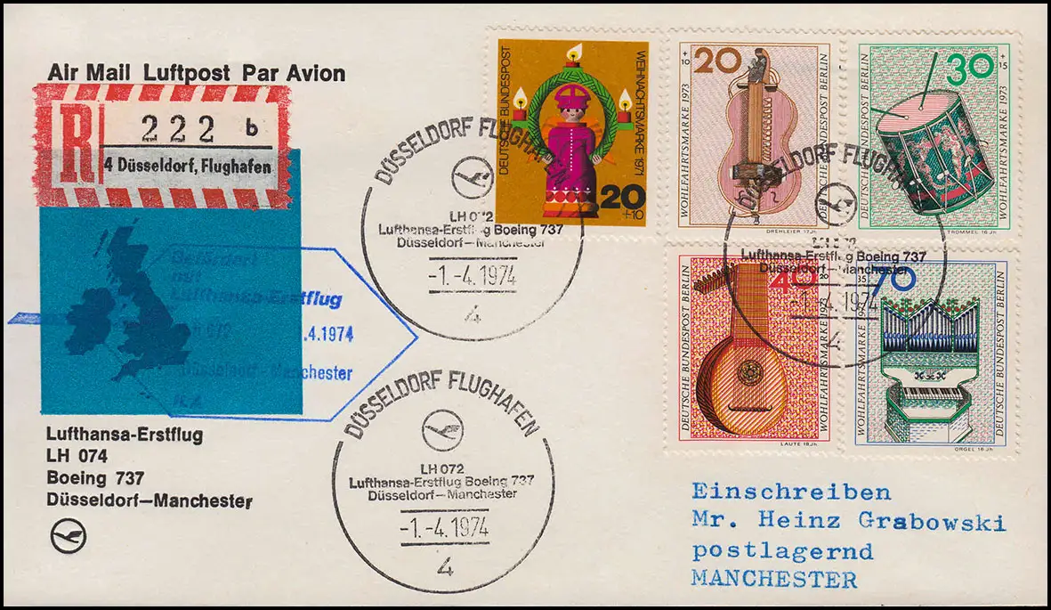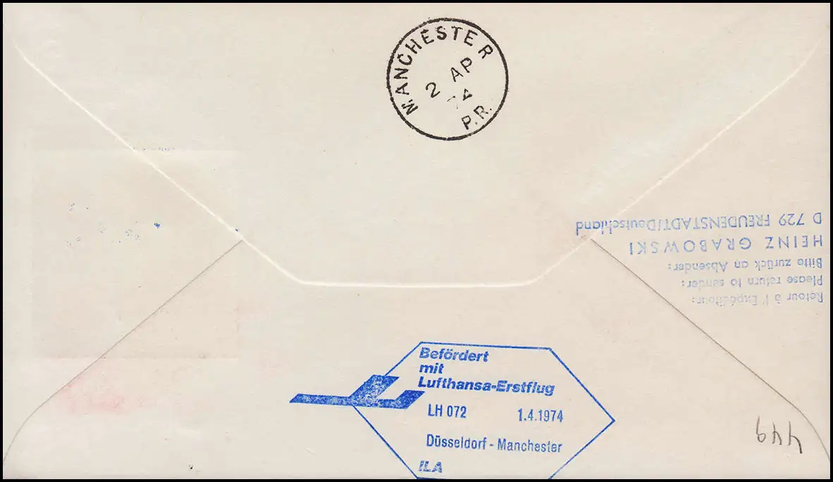 R-Lettre Lufthansa Premier vol LH 074 Boeing 737 DUSSELDORF/ MANCHESTER 1.4.1974