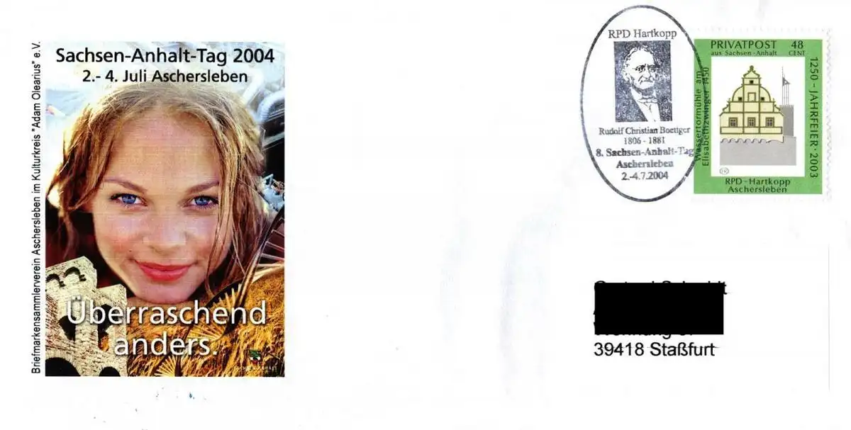 • MichSeite RPD Hartkopp: MiNr. 1, 12.04.2003, "1250 Jahre Aschersleben", 1. Auflage, Sonderbeleg, Sonderstempel "Rudolf Christian Boettger", echt gelaufen Beschreibung \nAusgabeland: Bundesrepublik Deutschland \nPostdienstleister: RPD Hartkopp, Aschersleben \nAusgabeanlass: Briefmarkenausgabe "1250 Jahre Aschersleben" Katalognummer: MiNr. 1 Ausgabedatum: 12.04.2003 Nominale: Wert zu 0,48 EUR \nTyp: - \nErhaltung: nassklebend, gezähnt, Ganzstück (Umschlag), Sonderstempel "Rudolf Christian Boettger / 8. Sachsen-Anhalt-Tag / Aschersleben", echt gelaufen \nHinweis: 1. Auflage (2003)