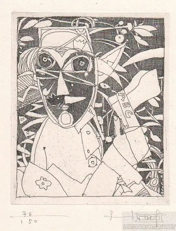 Bemerkungen: Zustand: Schönes sauberes Blatt // Signiert und nummeriert. Kunstgrafik. Druckgröße: 17 x 13,5 cm, aus der Grafikmappe Nr. 4. : Zum vierzigjährigen Bestehen des Verlages. Die Grafikmappe wurde in einer Auflage von 200 Exemplaren gedruckt. Davon sind 50 Exemplare römisch numeriert und nicht für den Verkauf bestimmt. Hussel, Horst (1934 Greifswald ? 2017 Berlin). Nummer 76 von 150