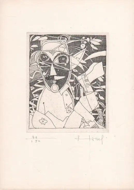 Bemerkungen: Zustand: Schönes sauberes Blatt // Signiert und nummeriert. Kunstgrafik. Druckgröße: 17 x 13,5 cm, aus der Grafikmappe Nr. 4. : Zum vierzigjährigen Bestehen des Verlages. Die Grafikmappe wurde in einer Auflage von 200 Exemplaren gedruckt. Davon sind 50 Exemplare römisch numeriert und nicht für den Verkauf bestimmt. Hussel, Horst (1934 Greifswald ? 2017 Berlin). Nummer 76 von 150