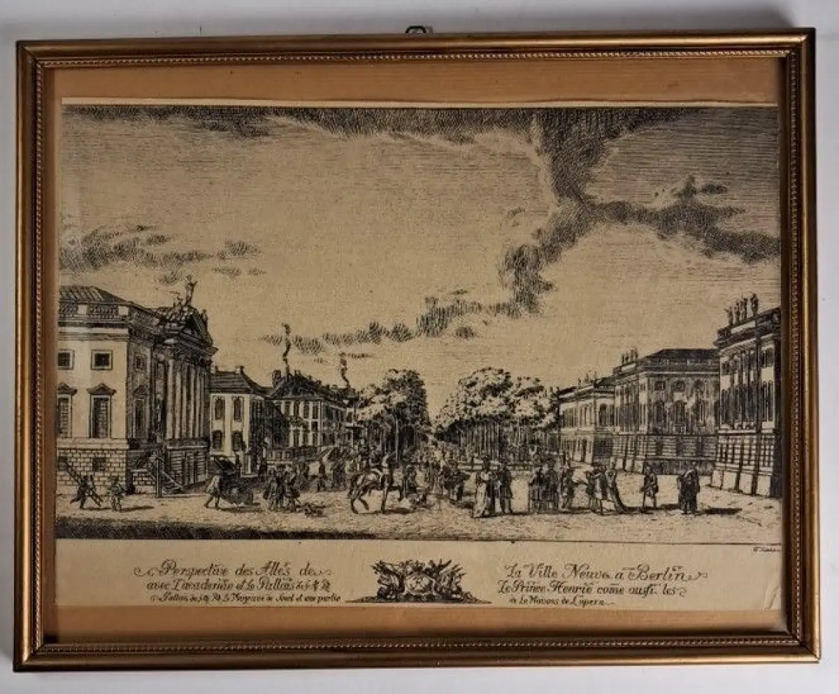 Bemerkungen: Zustand: Gut. Grafik altersbedingt leicht gebräunt und minimal fleckig // Es handelt sich um eine Radierung des Künstlers Carl Friedrich Fechhelm aus dem Jahre 1756. Die Grafik ist sehr knapp beschnitten. Das Motiv hat ein Maß von 18,5 x 30,0 cm. Es befindet sich in einem golden lackierten Holzrahmen hinter Glas, welcher ebenfalls in einem guten Zustand ist.